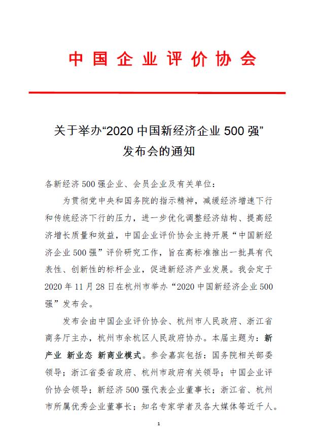 关于举办“2020中国新经济企业500强” 发布会的通知