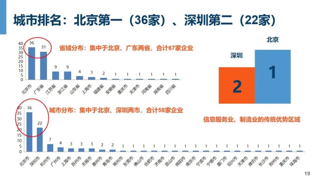 在城市排名中,北京以36家企业入榜位居榜首,深圳以21家紧随其后,而这两地正式信息服务业和制造业的传统优势区域。